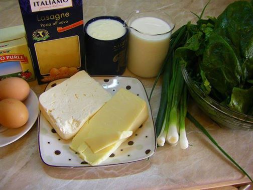 ЗА 4-5 ПОРЦИИ: 1/2 КУТИЯ КОРИ ЗА ЛАЗАНЯ, 1 КГ СПАНАК, 200 ГР НАТРОШЕНО СИРЕНЕ, 1 ВРЪЗКА ЗЕЛЕН ЛУК, ОКОЛО 150-200 ГР КАШКАВАЛ, 1 СУПЕНА ЛЪЖИЦА ДЖОДЖЕН, 1 ЧАЕНА ЧАША КИСЕЛО МЛЯКО, 400 МЛ ПРЯСНО МЛЯКО, 4 ЯЙЦА, 100 МЛ ДОМАТЕНО ПЮРЕ, СОЛ НА ВКУС, ОКОЛО 50-60 МЛ ОЛИО