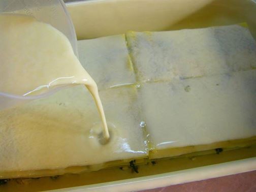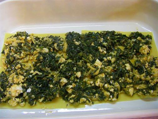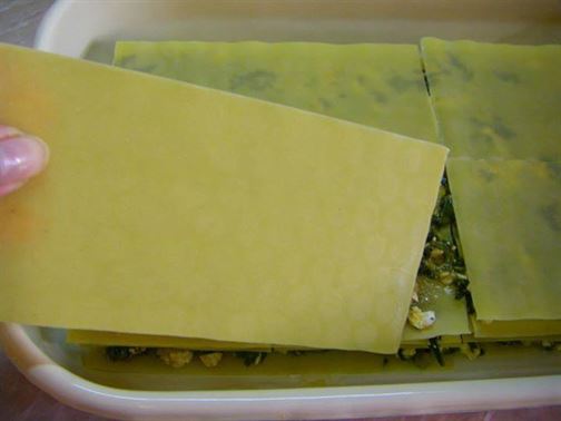 ЛУКЪТ СЕ НАРЯЗВА НА СИТНО И СЕ ЗАДУШАВА В МАЗНИНАТА, ДОБАВЯ СЕ ИЗМИТИЯТ И НАРЯЗАН СПАНАК. КОГАТО И ТОЙ ОМЕКНЕ, СЕ ДОБАВЯ ДОМАТЕНОТО ПЮРЕ, ДЖОДЖЕНА, СОЛ НА ВКУС И СЕ ОСТАВЯ ДА ПОВРИ, ДОКАТО СЕ СГЪСТИ. ОТСТРАНЯВА СЕ ОТ ОГЪНЯ И СЛЕД КАТО СЕ ПООХЛАДИ, СЕ ДОБАВЯТ СИРЕНЕТО И ПОЛОВИНАТА ОТ ЕДРО НАСТЪРГАНИЯ КАШКАВАЛ (КАКТО МОЖЕ ДА ВИДИТЕ ОТ СНИМКИТЕ "СТЪПКА ПО СТЪПКА"). В ПРАВОЪГЪЛНА ТАВА СЕ РЕДЯТ НА ПЛАСТОВЕ КОРИ И ПЛЪНКА, КАТО СЕ ЗАВЪРШВА С КОРИ. ПРАВИ СЕ ЗАЛИВКА ОТ ЯЙЦАТА , ДВАТА ВИДА МЛЯКО И ДОБАВЯТЕ ОКОЛО 100 МЛ ВОДА. С ГОТОВАТА СМЕС СЕ ЗАЛИВА ЛАЗАНЯТА. ЗАПИЧА СЕ НА 180-200 ГРАДУСА, ДОКАТО СТЕГНЕ ЗАЛИВКАТА, СЛЕД КОЕТО СЕ ПОРЪСВА С ОСТАНАЛАТА ЧАСТ ОТ НАСТЪРГАНИЯ КАШКАВАЛ И СЕ ДОПИЧА ДО ЗЛАТИСТ ЦВЯТ. ЯСТИЕТО СТАВА ЛЕСНО И МНОГО ВКУСНО. ПРОБВАЙТЕ И СПОДЕЛЕТЕ. ДА ВИ Е СЛАДКО.