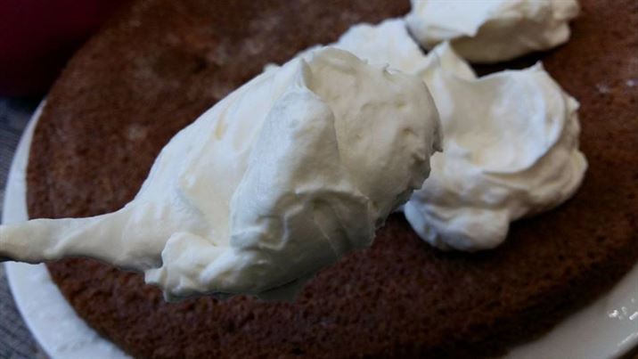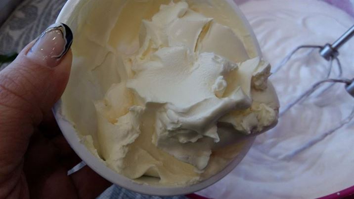 Кремът за тортата приготвяте като разбъркате добре с миксер сметаната и пудрата захар. Към нея прибавяте маскарпонето,