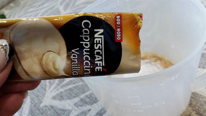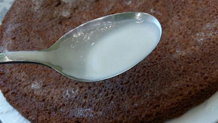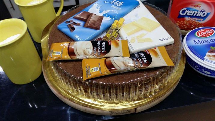 Разтваряте капучиното в топлото прясно мляко със захарта и започва сглобяването на тортата