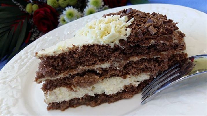 отгоре я поръсвате обилно с настърган шоколад. Торта е сглобена, но трябва да престои 5-6 часа в хладилника.