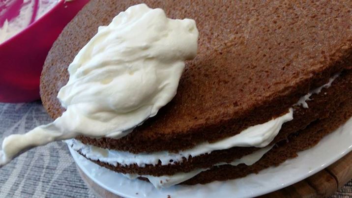 Повтаряте процедурата с втория и третия блат - слагате блат, сироп и отново крем, като след третия блат намазвате тортата с крем и отстрани,