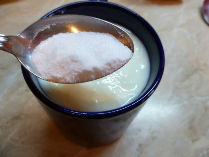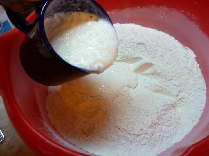 Добавете содата към киселото мляко. Разбъркайте и щом започне да кипи, го излейте при брашното.