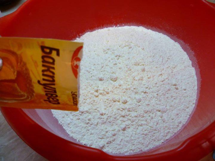 В голяма дълбока купа изсипете малко повече от половината брашно и го смесете с бакпулвера.