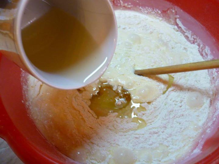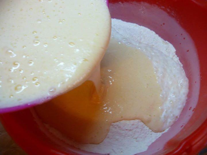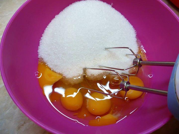В отделна купа разбийте яйцата със захарта до побеляване. Прибавете сместа към купата с брашното.