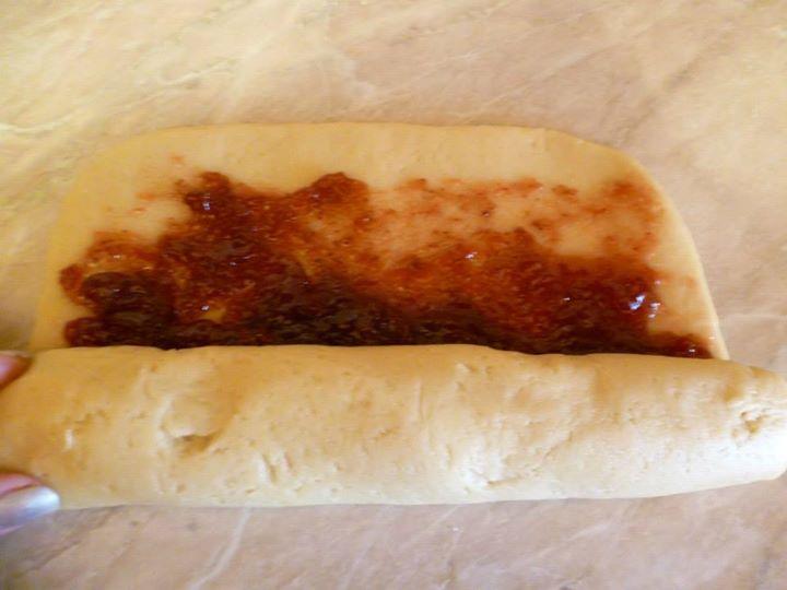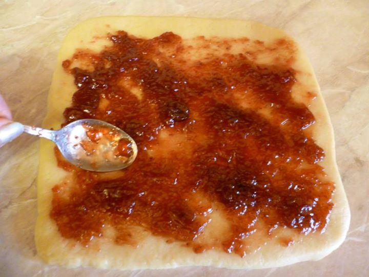 Намажете равномерно с мармалад и навийте на стегнато руло.