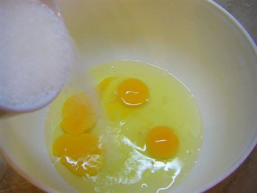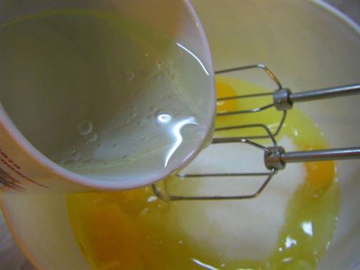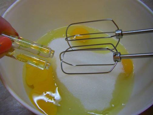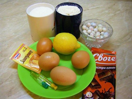 4 яйца 1 1/2 чаена чаша захар 1/2 чаена чаша олио+1/2 чаена чаша вода 2 чаени чаши брашно (пресято) 1 бакпулвер 1 ванилия кората на един лимон +1 есенция лимон ЗА УКРАСАТА: мини шоколадови яйца, 100 гр натурален шоколад, 1 чаена лъжица масло.
