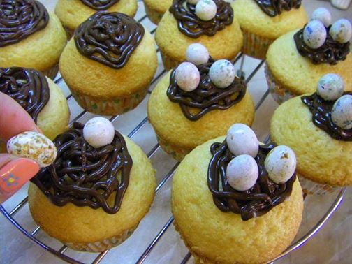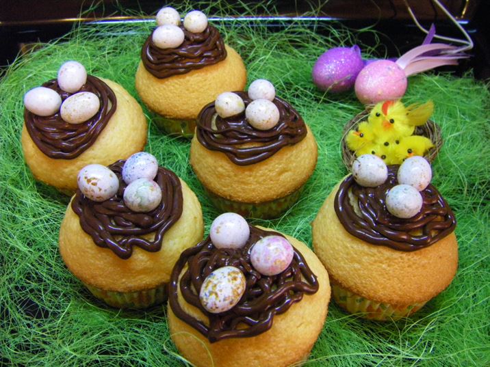 От всички продукти се приготвя кексово тесто.Получава се жълта смес.В 16-18 чашки за мъфини се поставят хартиени формички(малки кексчета). Формите за мъфини се напълват със сместа. (както може да видите от снимките “стъпка по стъпка”).Пекат се във фурна на 200 градуса около 20 минути.Оставят се да изстинат. Разтопява се на водна баня шоколада с маслото. Украсяват се охладените мъфини, като се оформя гнездо и в него слагате по няколко мини шоколадови яйца. Това е просто идея за весел и вкусен Великден! ПРОБВАЙТЕ И СПОДЕЛЕТЕ. ДА ВИ Е СЛАДКО.