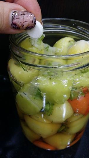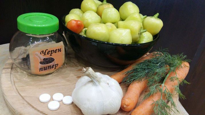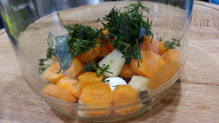 На дъното на всяко бурканче сложете чесън, морков, 3-4 зърна черен пипер, копър и един аспирин