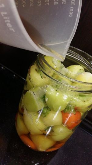 Залейте с оцет до половината на напълнените с люти чушки бурканчета и допълнете със студена вода до горе. Затворете ги веднага и в продължение на 4-5 дни обръщайте бурканите нагоре-надолу.
