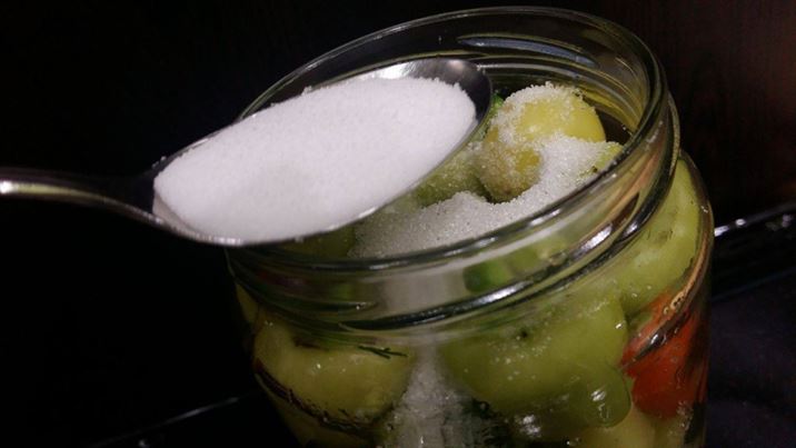 върху тях нареждате лютите чушки максимално плътно. Отгоре прибавяте захарта , солта