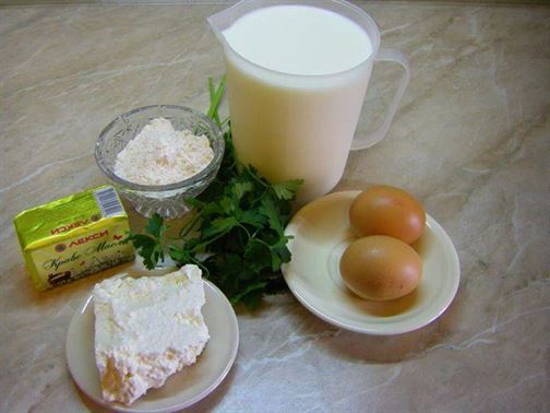 1 ЛИТЪР ПРЯСНО МЛЯКО,3-4 СУПЕНИ ЛЪЖИЦИ ОЛИО, 3 РАВНИ СУПЕНИ ЛЪЖИЦИ БРАШНО, 2 ЯЙЦА, 1 СУПЕНА ЛЪЖИЦА МАСЛО,МАГДАНОЗ, СИРЕНЕ, СОЛ НА ВКУС, ЧЕРЕН ПИПЕР ПОЖЕЛАНИЕ.