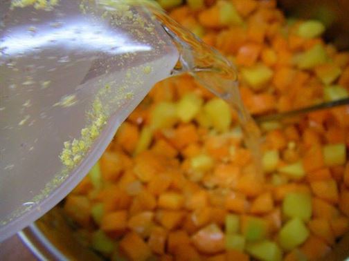 ЗАЛЕЙТЕ С 2 ЛИТРА ПИЛЕШКИ БУЛЬОН И ОСТАВЕТЕ СУПАТА ДА ВРИ ДО ПЪЛНА ГОТОВНОСТ НА ЗЕЛЕНЧУЦИТЕ