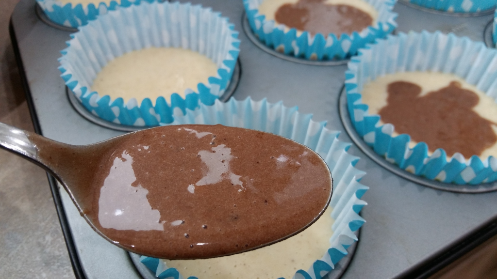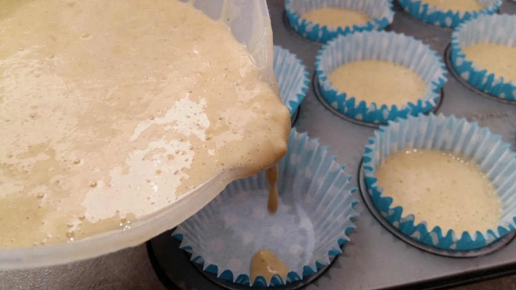 Разсипете жълтата смес в хартиени формички за кексчета като ги напълните 2/3 от обема им,