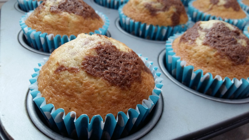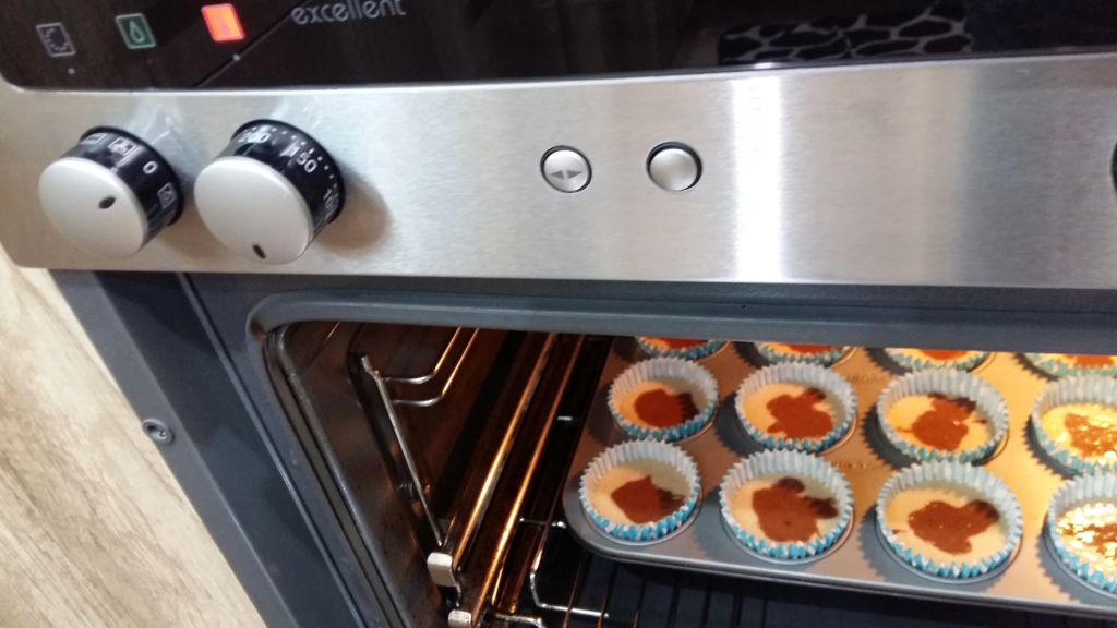 Изпечете ги за 20 мин. в предварително загрята на 200* фурна. Проверявате дали са изпечени като го боцнете с клечка за зъби - ако излезе суха мъфините са готови.