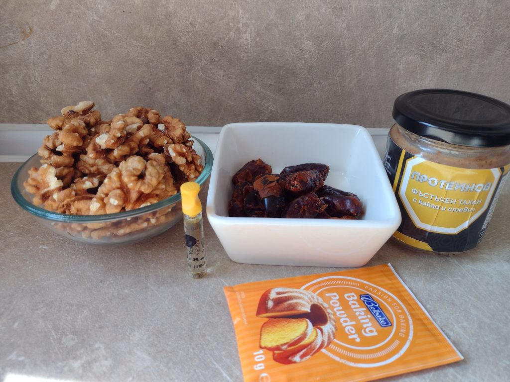 Нарежете фурмите на парчета и ги залейте с горещата вода и изчакайте поне 30 мин, за да омекнат. Прехвърлете фурмите заедно с водата в блендер и ги пасирайте, докато станат на каша. Орехите ги пуснете за кратко в блендера. Прехвърлете ги в купа, прибавете бакпулвера и разбъркайте добре. Добавете пасираните фурми, ванилията и тахана. Размесете добре, докато получите лепкаво тесто. С влажни ръце оформете топчета с големина на орех и ги подредете в тава, застлана с хартия за печене. Изпечете ги до златисто в загрята на 160 градуса фурна за около 20 минути. Пробвайте и споделете. Да ви е сладко!