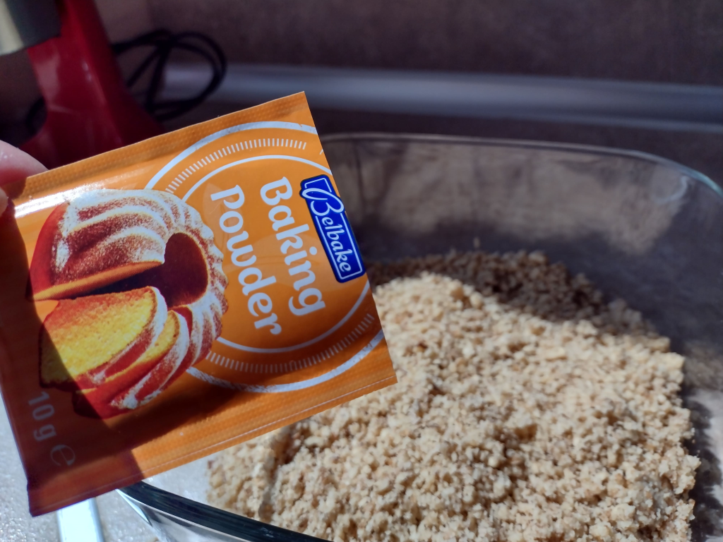 Прехвърлете ги в купа, прибавете бакпулвера и разбъркайте добре.