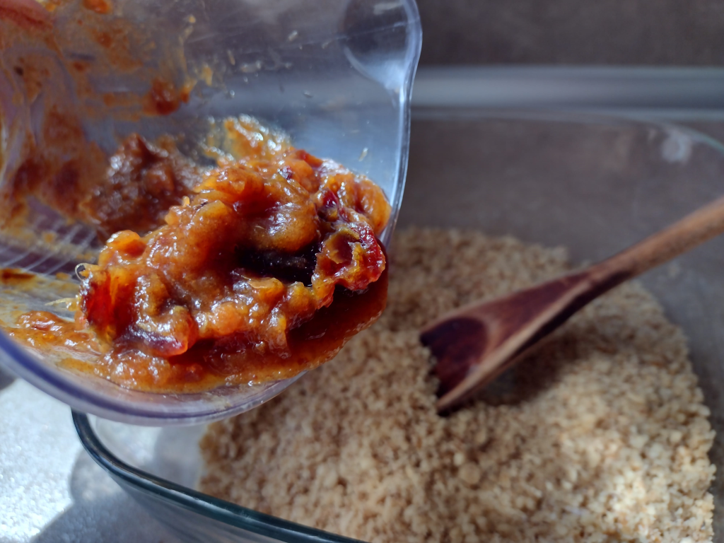 Нарежете фурмите на парчета и ги залейте с горещата вода и изчакайте поне 30 мин, за да омекнат. Прехвърлете фурмите заедно с водата в блендер и ги пасирайте, докато станат на каша.
