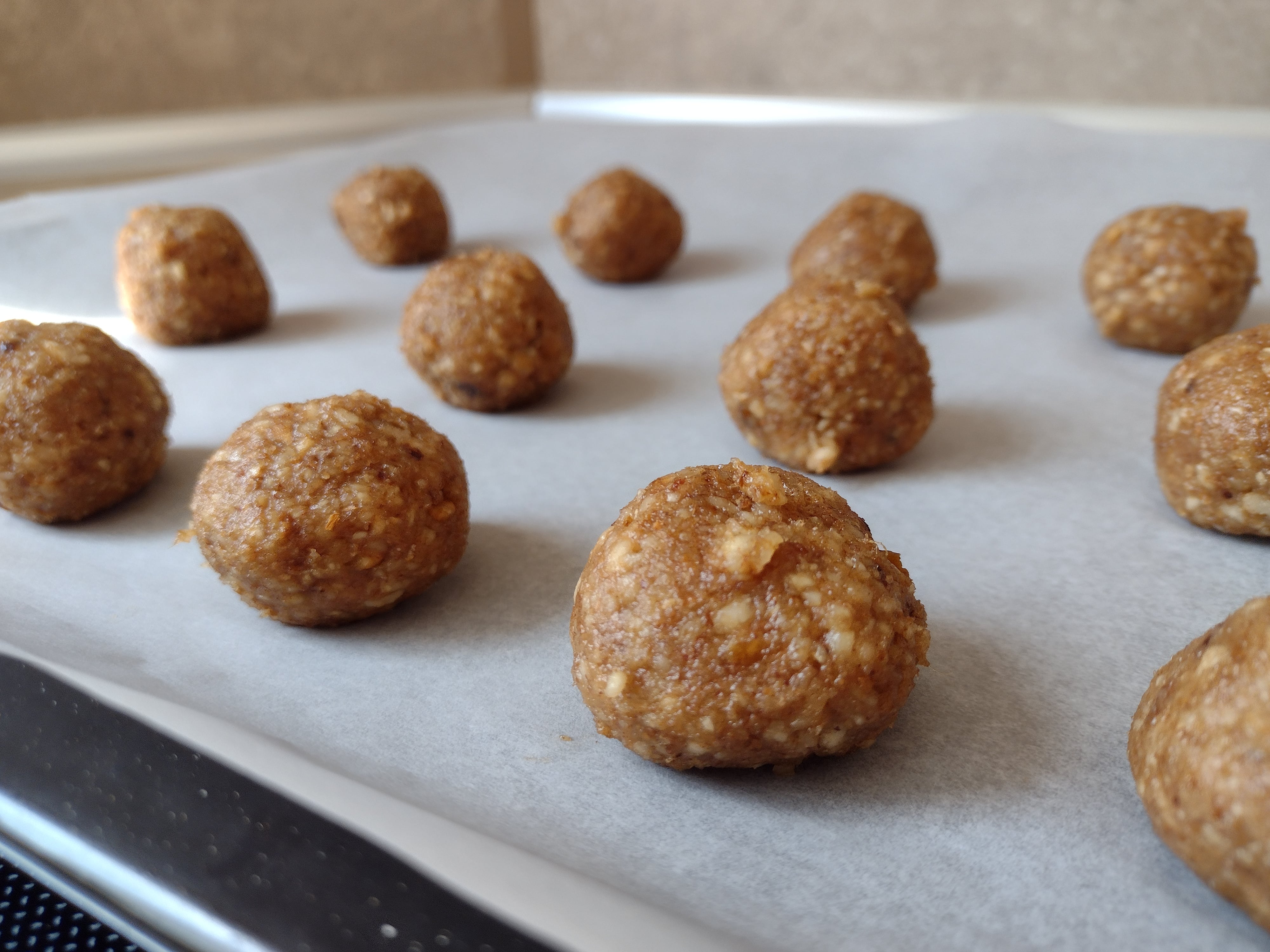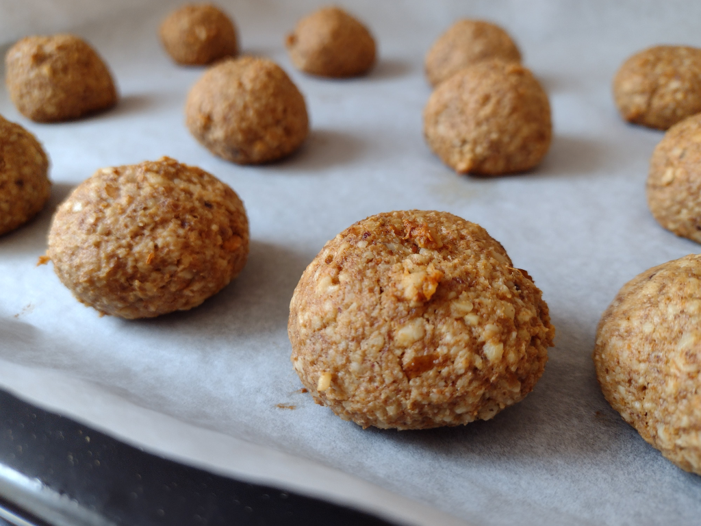 С влажни ръце оформете топчета с големина на орех и ги подредете в тава, застлана с хартия за печене. Изпечете ги до златисто в загрята на 160 градуса фурна за около 20 минути.