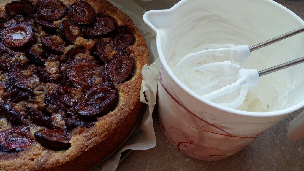 Охлаждаме изпечения пай поне за 30-40 минути. Разбиваме сметаната.