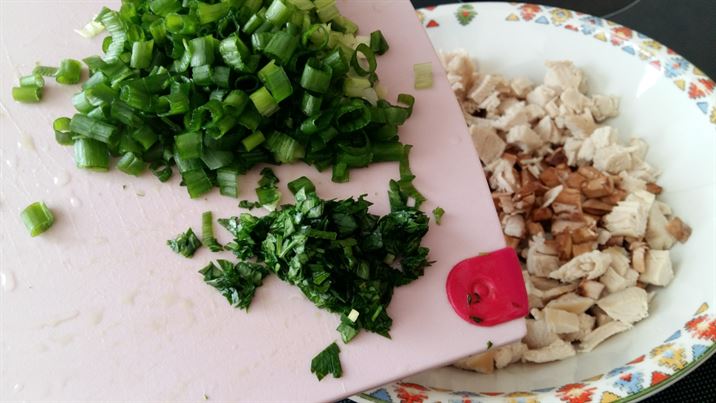 Измийте и почистете гъбите, отделете и нарежете на ситно пънчетата