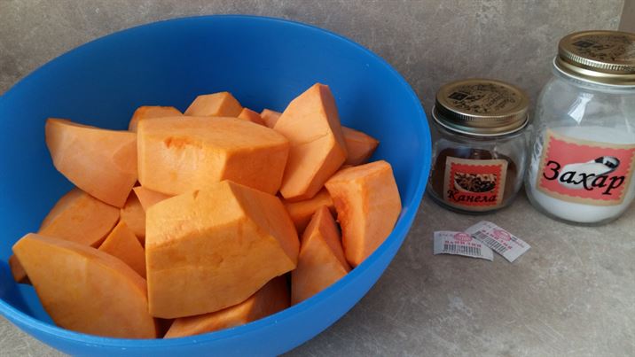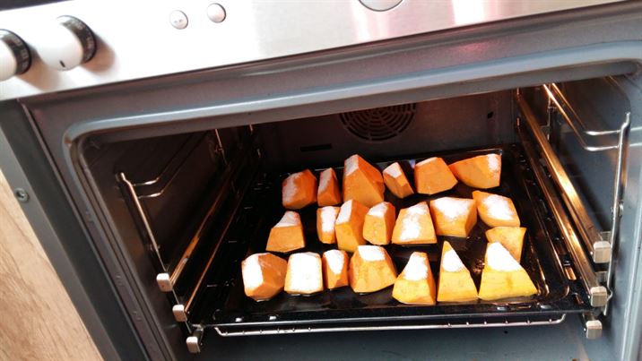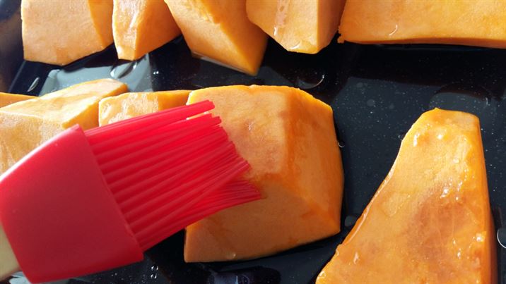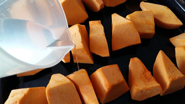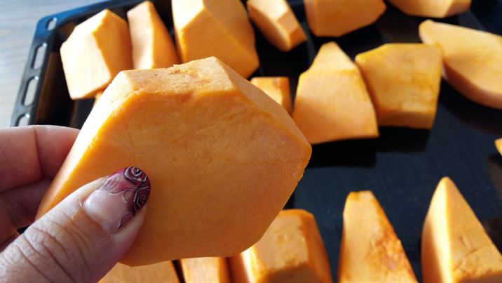 Тиквата се измива добре (аз използвах тиква-цигулка), почиства се от семките и нарязва на парчета. Намазвате с олио подходяща тава и нареждате парчетата тиква в нея.