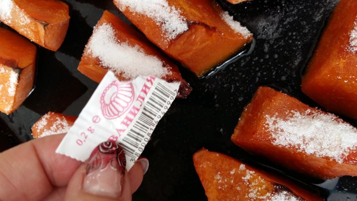 Когато вече е почти готова, изваждате тиквата и отново поръсвате с малко захар