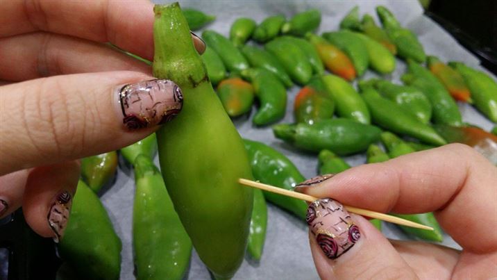 Може да изпечете чушките на скара или както е в моя случай във фурната. Важното е да изпечете чушките от всички страни, а за да не се пукат и да започне да хвърчи семето на чушките, преди печене с клечка за зъби продупчете всяка чушка.