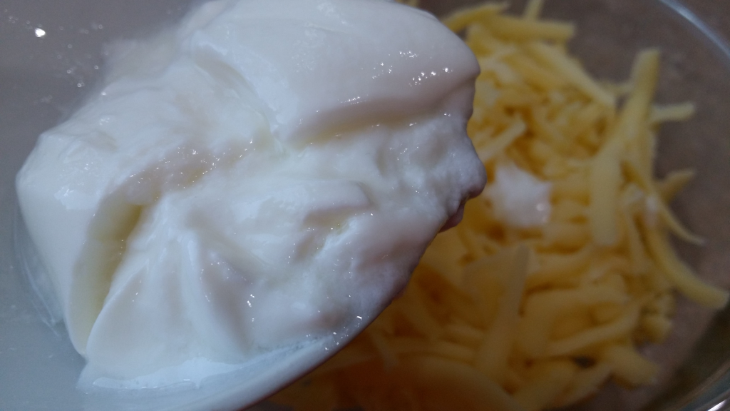 Месото се нарязва на парчета, поръсва се със сол и със соев сос. Лукът се нарязва на ситно и се задушава в 2-3 супени лъжици зехтин няколко минути до омекване. Кашкавалът се настъргва и се смесва с киселото мляко и майонезата. Месото се слага в йенска тенджера,отгоре се слага задушеният лук, сипва се 100 мл вода, а най-отгоре се слага кашкавалено майонезената смес. Захлупвате с капак и печете ястието на 200С за 40-45 минути. Маха се капака и се допича още 10-15 минути до златист цвят. Пробвайте и споделете. Да ви е сладко!