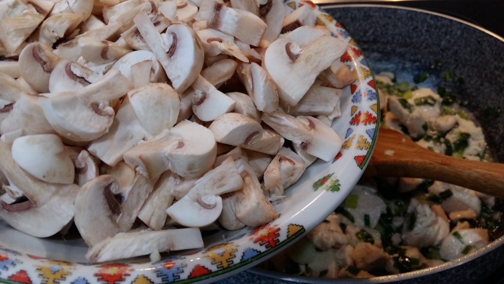 След това прибавете едро нарязаните гъби. Задушете за 10 минути, докато ястието остане на мазнина.