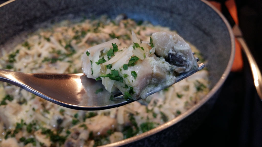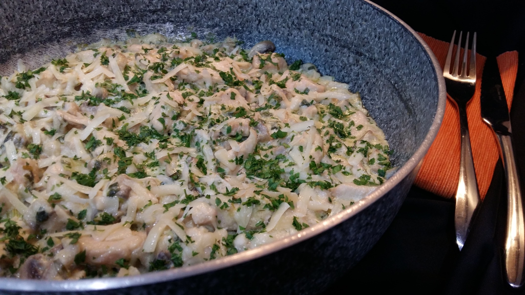 Месото нарежете на хапки. Загрейте маслото в тиган на средна температура и в него задушете месото, докато побелее. Прибавете нарязания на ситно лук и чесън за около 3-4 минути да се задушат към пилешкото. След това прибавете едро нарязаните гъби. Задушете за 10 минути, докато ястието остане на мазнина. Подправете със сол на вкус. Добавете сметаната и бъркайте сместа, докато стане кремообразна и се сгъсти. Ще отнеме приблизително още 5 минути. Накрая поръсете с пармезан и магданоз. Пробвайте и споделете. Да ви е сладко!