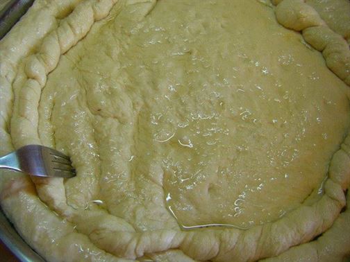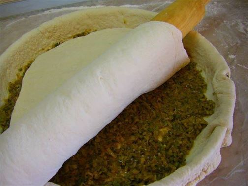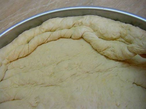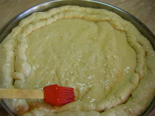 700 МЛ ХЛАДКА ВОДА, 40 ГР КУБЧЕ МАЯ, 2 СУПЕНИ РАВНИ ЛЪЖИЦИ ЗАХАР, 1 РАВНА ЛЪЖИЦА СОЛ, ОКОЛО 1,200 КГ БРАШНО (ПРЕСЯТО) ЗА ПЛЪНКАТА: 100 МЛ ОЛИО, 3-4 СТРЪКА ПРАЗ, 1 СУПЕНА ЛЪЖИЦА СУХА ЧУБРИЦА, 1 РАВНА ЛЪЖИЦА ЧЕРВЕН ПИПЕР, СОЛ НА ВКУС, 250 МЛ ВОДА.