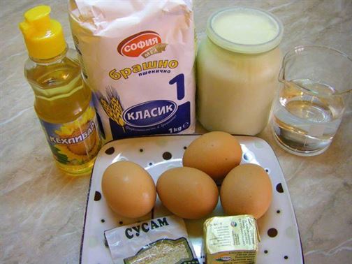 4 ЯЙЦА, 150 МЛ ТОПЛА ВОДА, 200 ГР КИСЕЛО МЛЯКО, 1 СУПЕНА ЛЪЖИЦА ЗАХАР, 1 СУПЕНА ЛЪЖИЦА СОЛ, 40 ГР МАЯ, 3-4 СУПЕНИ ЛЪЖИЦИ ОЛИО, ОКОЛО 950 ГР БРАШНО, ЧУБРИЦА И СУСАМ ЗА ПОРЪСВАНЕ.