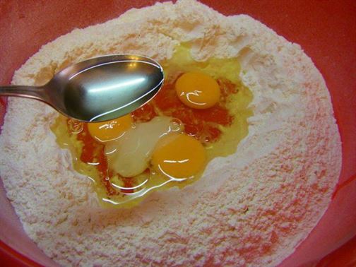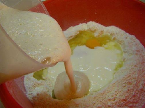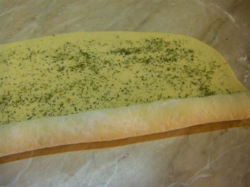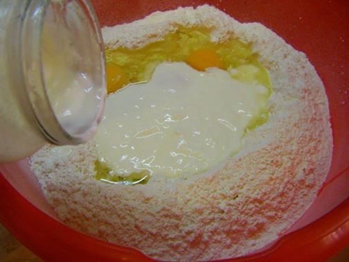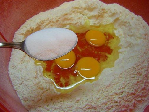 ОСТАНАЛАТА ЧАСТ ОТ ТЕСТОТО ФОРМЯ МЕ НА ТОПЧЕ И Я СЛАГАМЕ В СРЕДАТА. ОСТАВЯМЕ ЗА 15 МИНУТИ НА ТОПЛО ДА ВТАСА