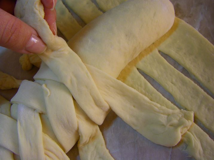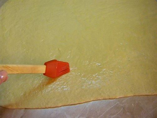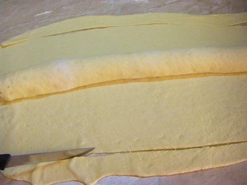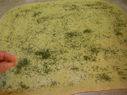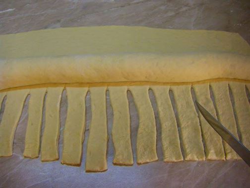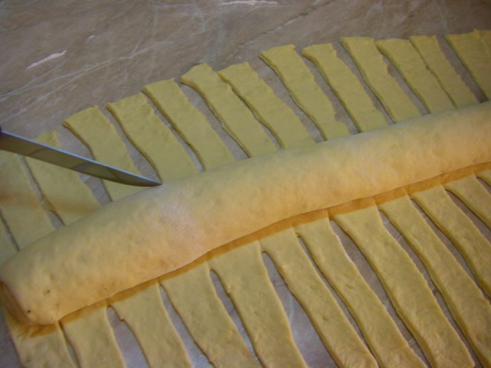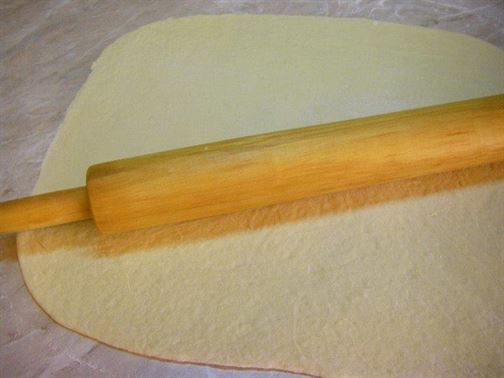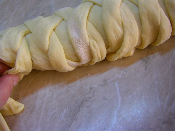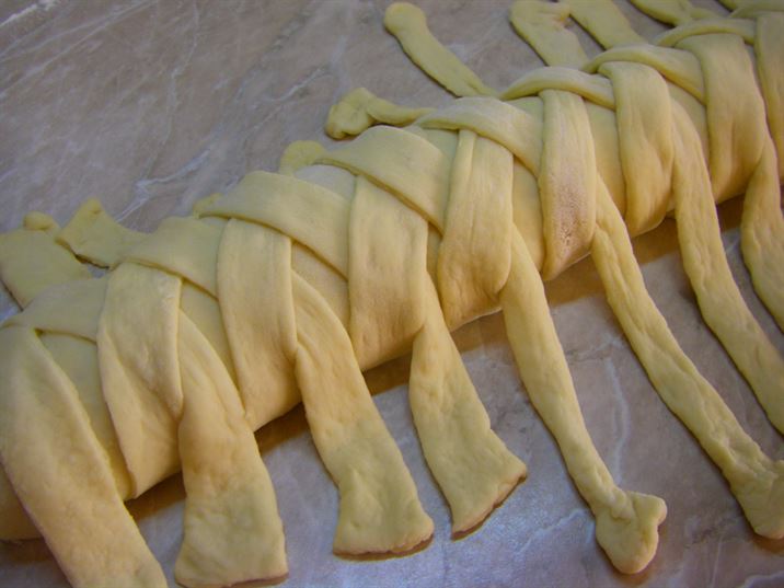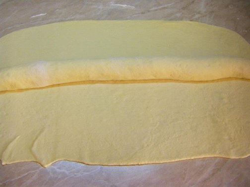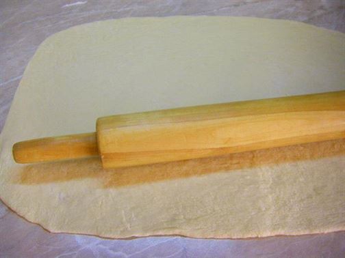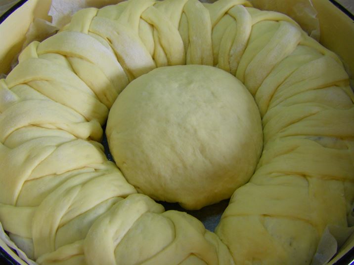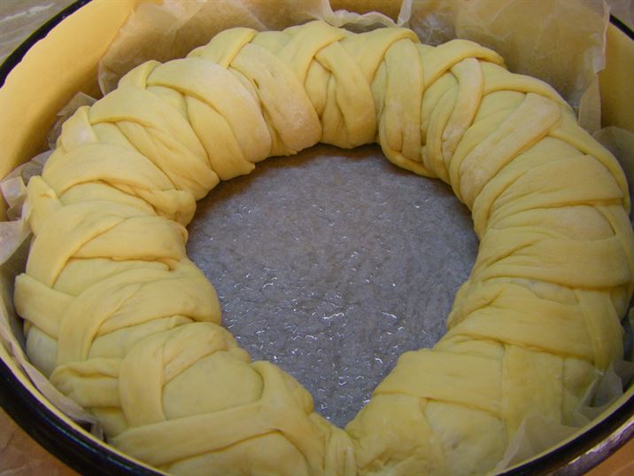 СЛАГАМЕ В ТАВА 30-32 СМ ЗАСТЛАНА С ХАРТИЯ И ЛЕКО НАМАЗАНА С МАЗНИНА, КАТО ОФОРМЯМЕ РУЛОТО НА ВЕНЕЦ