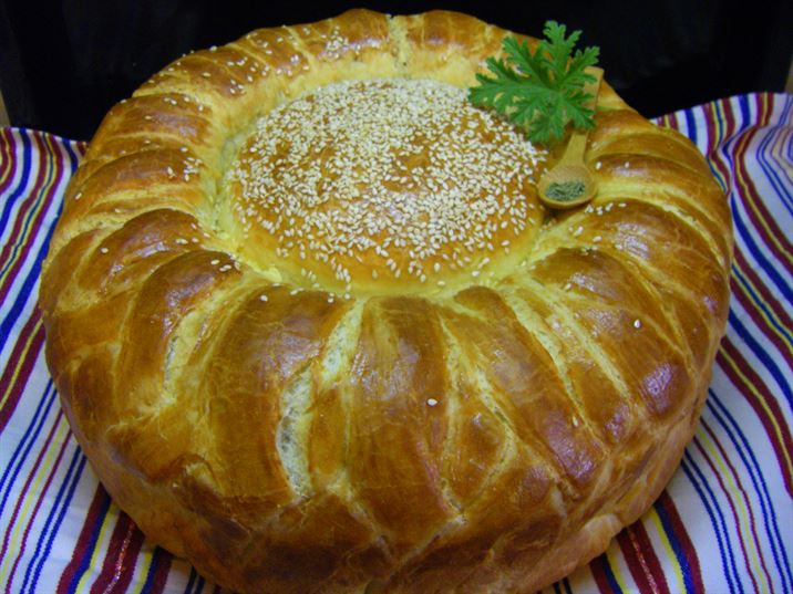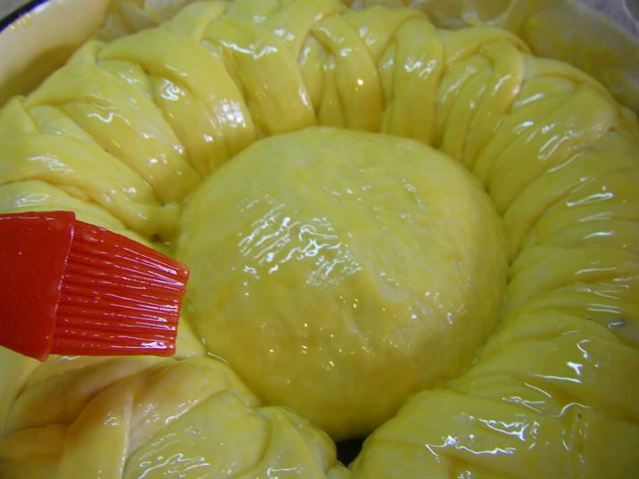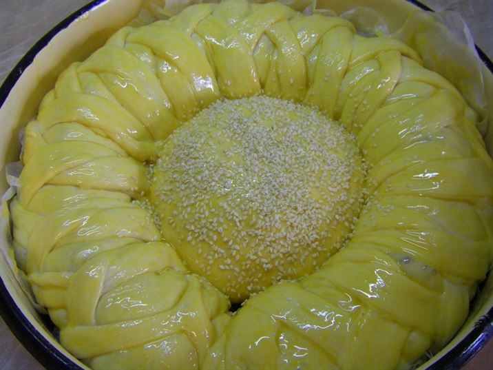 В ПОДХОДЯЩ ДЪЛБОК СЪД РАЗТВАРЯМЕ МАЯТА В ТОПЛАТА ВОДА, ПРИБАВЯМЕ ЗАХАРТА И 2-3 СУПЕНИ ЛЪЖИЦИ БРАШНО. РАЗБЪРКВАМЕ И ОСТАВЯМЕ ДА УДВОИ ОБЕМА СИ. ПРЕЗ ТОВА ВРЕМЕ ПРЕСЯВАМЕ БРАШНОТО, ПРАВИМ КЛАДЕНЧЕ И В НЕГО СЛАГАМЕ ЯЙЦАТА, (КАТО ОТДЕЛЯМЕ ЕДИН ЖЪЛТЪК ЗА НАМАЗВАНЕ НА ПОГАЧАТА) ПРИБАВЯМЕ СОЛТА, КИСЕЛОТО МЛЯКО, ОЛИОТО И ВЕЧЕ БУХНАЛАТА МАЯ. МЕСИМ МЕКО ТЕСТО, КОЕТО ПОКРИВАМЕ С КЪРПА И ОСТАВЯМЕ НА ТОПЛО ЗА 30 МИНУТИ ДА УДВОИ ОБЕМА СИ (ДА ВТАСА). РАЗДЕЛЯМЕ ТЕСТОТО НА ТРИ КАТО ДВЕТЕ ЧАСТИ СА ПО 700 ГР, А ТРЕТАТА Е 340-350 ГР (КАКТО МОЖЕ ДА ВИДИТЕ ОТ СНИМКИТЕ "СТЪПКА ПО СТЪПКА"). РАЗТОЧВАМЕ ДВЕТЕ ПО ГОЛЕМИ ЧАСТИ НА ПРАВОЪГЪЛНИ КОРИ. ЕДНАТА КОРА МАЖЕМ С ОЛИО, ПОРЪСВАМЕ С ГРАДИНСКА ЧУБРИЦА И НАВИВАМЕ НА РУЛО. СЛАГАМЕ В СРЕДАТА НА ВТОРАТА КОРА ГОТОВОТО РУЛО И НАРЯЗВАМЕ ДВЕТЕ СТРАНИ НА КОРАТА НА ЛЕНТИ, КАТО РЕЖЕМ ДО РУЛОТО. ОФОРМЯМЕ ОТНОВО НА РУЛО, КАТО ПРЕПЛИТАМЕ ЛЕНТИТЕ ДИАГОНАЛНО ЕДНА ВЪРХУ ДРУГА. ПОДГЪВАМЕ КРАИЩАТА НАВЪТРЕ. СЛАГАМЕ В ТАВА 30-32 СМ ЗАСТЛАНА С ХАРТИЯ И ЛЕКО НАМАЗАНА С МАЗНИНА, КАТО ОФОРМЯМЕ РУЛОТО НА ВЕНЕЦ. ОСТАНАЛАТА ЧАСТ ОТ ТЕСТОТО ФОРМЯ МЕ НА ТОПЧЕ И Я СЛАГАМЕ В СРЕДАТА . ОСТАВЯМЕ ЗА 15 МИНУТИ НА ТОПЛО ДА ВТАСА . НАМАЗВАМЕ С ОТДЕЛЕНИЯ ЖЪЛТЪК РАЗБИТ С ЕДНА КАФЕНА ЛЪЖИЦА ОЛИО. ПОРЪСВАМЕ САМО В СРЕДАТА СЪС СУСАМ И ПЕЧЕМ НА 180-200 ГРАДУСА ДО ЗЛАТИСТ ЦВЯТ. ПОГАЧАТА СТАВА ПУХКАВА И МНОГО АРОМАТНА. ПРОБВАЙТЕ И СПОДЕЛЕТЕ. ДА ВИ Е СЛАДКО.