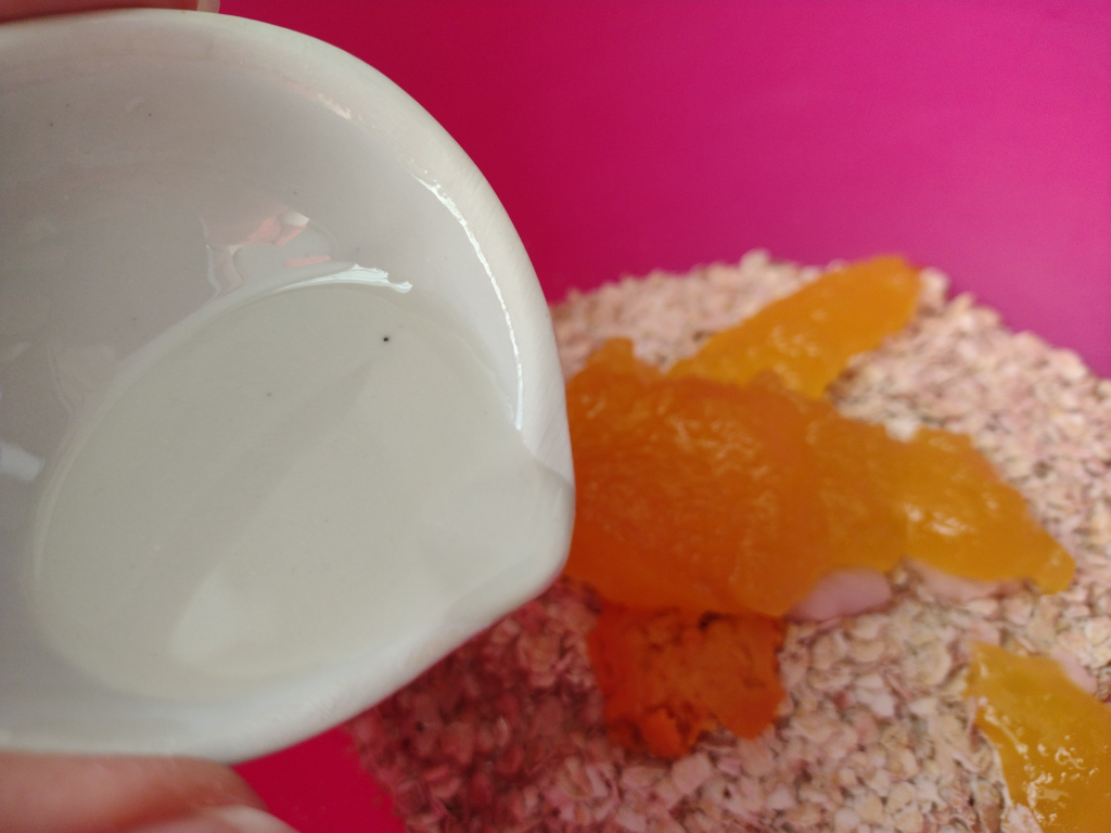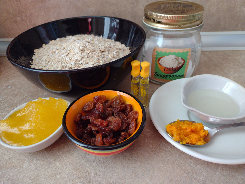 В дълбока купа изсипете овесените ядки. Угасете содата бикарбонат в оцета. Прибавете към овесените ядки. Прибавете портокаловата кора, меда, олиото и ванилията. Започнете да добавяте постепенно топлата вода и бъркайте, докато се получи тесто. Накрая прибавете и стафидите. С помоща на супена лъжица слагайте от сместа в тава, застлана с хартия за печене. Печете бисквитите в предварително загрята на 200 С фурна за 10 минути до златист цвят. Пробвайте и споделете. Да ви е сладко!