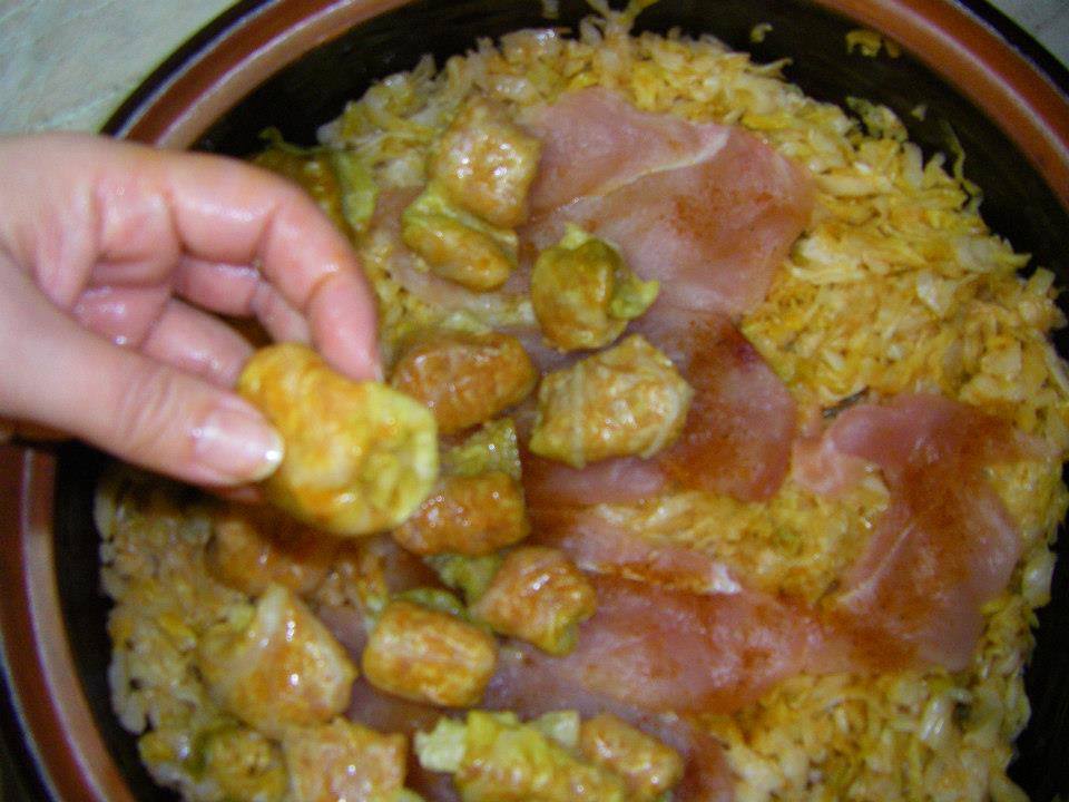 МЕСОТО СЕ НАРЯЗВА КАТО ЗА ПЪРЖОЛИ.ЛЕКО СЕ НАЧУКВАТ И СЕ ПОРЪСВАТ С ПОДПРАВКИТЕ .РЕЖЕМ ЗЕЛЕТО НА СИТНО И ГО ЗАДУШАВАМЕ В ОЛИОТО ХУБАВО, ДОКАТО ПО ОМЕКНЕ .МАХАМЕ ГО ОТ ОГЪНЯ ,ПРИБАВЯМЕ ЧЕРВЕНИЯ ПИПЕР И ХУБАВО ГО РАЗБЪРКВАМЕ СЪС ЗЕЛЕТО.В ГОЛЯМ ГЮВЕЧ ПОСТАВЯМЕ ПОЛОВИНАТА ОТ ЗАДУШЕНОТО ЗЕЛЕ(КАКТО МОЖЕ ДА ВИДИТЕ ОТ СНИМКИТЕ "СТЪПКА ПО СТЪПКА") И ВЪРХУ НЕГО НАРЕЖДАМЕ СВИНСКОТО МЕСО,ПОСЛЕ СЛАГАМЕ ОСТАНАЛАТА ЧАСТ ОТ ЗЕЛЕТО И ПОДРЕЖДАМЕ ПИЛЕШКОТО МЕСО.ОМЕСВАМЕ ВСИЧКИ ПРОДУКТИ ЗА САРМИТЕ БЕЗ ЗАДУШАВАНЕ (ВСИЧКО СУРОВО) .СВИВАМЕ САРМИТЕ (КАКТО МОЖЕ ДА ВИДИТЕ ОТ СНИМКИТЕ"СТЪПКА ПО СТЪПКА") И СЪС САРМИТЕ ПОКРИВАМЕ ПИЛЕШКИТЕ ПЪРЖОЛИ.ОТГОРЕ СЛАГАМЕ ЧИНИЯ ДА ПРИТИСКА САРМИТЕ.ЗАЛИВАМЕ ГЮВЕЧА С ВРЯЩА ВОДА ДО РАВНО НИВО НА САРМИТЕ.СЛАГАМЕ ВЪВ ФУРНАТА НА 180 ГРАДУСА ЗА 3-4 ЧАСА.