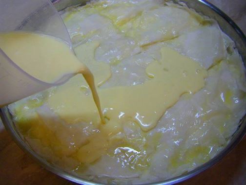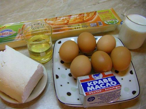 1 ПАКЕТ КОРИ ЗА БАНИЦА, 50 МЛ ОЛИО ЗА ПЛЪНКАТА: 350 ГР СИРЕНЕ, 4-5 СУПЕНИ ЛЪЖИЦИ КИСЕЛО МЛЯКО, 1 (10 ГР) БАКПУЛВЕР, 2 ЯЙЦА. ЗА ЗАЛИВКАТА: 250-300 МЛ ПРЯСНО МЛЯКО, 4 ЯЙЦА, 50-60 ГР МАСЛО (РАЗТОПЕНО)