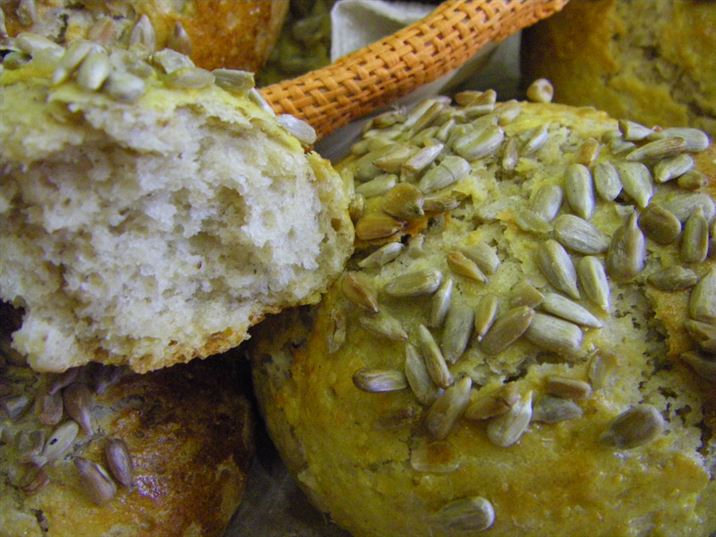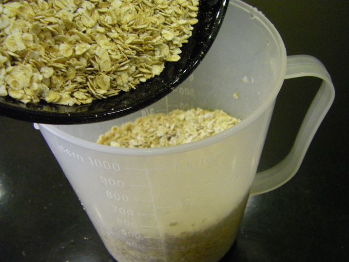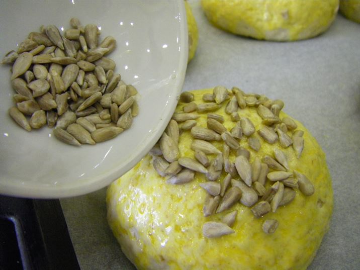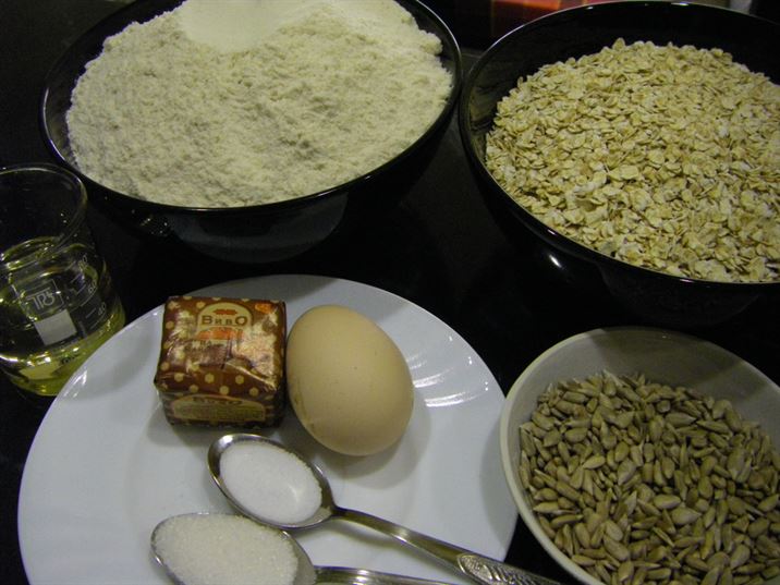 250 ГРАМА ОВЕСЕНИ ЯДКИ, 500 ГРАМА ТИПОВО БРАШНО, 20 ГР МАЯ, 1 ЧАЕНА ЛЪЖИЦА ЗАХАР, 1 ЧАЕНА ЛЪЖИЦА СОЛ, 60 МЛ ОЛИО,1 ЖЪЛТЪК,СУРОВ СЛЪНЧОГЛЕД ЗА ПОРЪСВАНЕ.