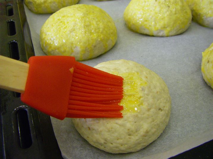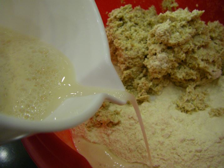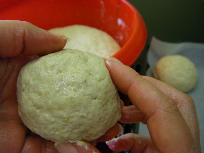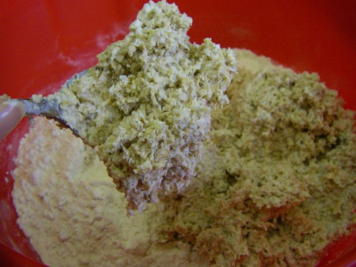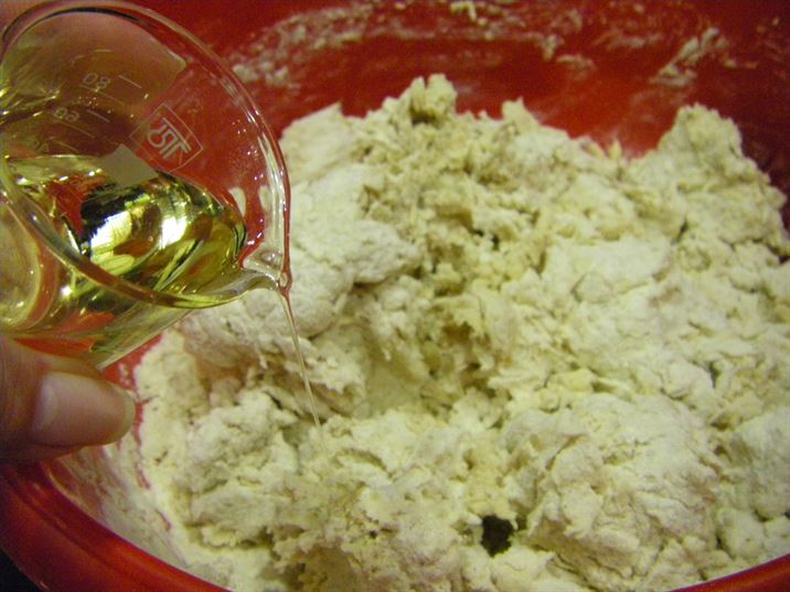 ЗАМЕСЕТЕ ТЕСТОТО , КАТО ПРИ ИЗМЕСВАНЕТО СЛАГАЙТЕ ОТ ОЛИОТО И МЕСЕТЕ. ПОЛУЧАВА СЕ СРЕДНО ТВЪРДО ТЕСТО.