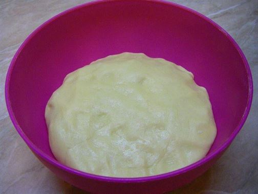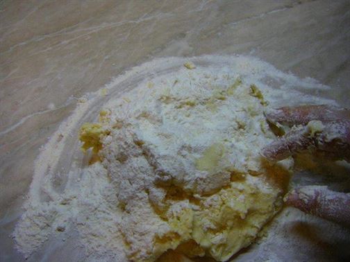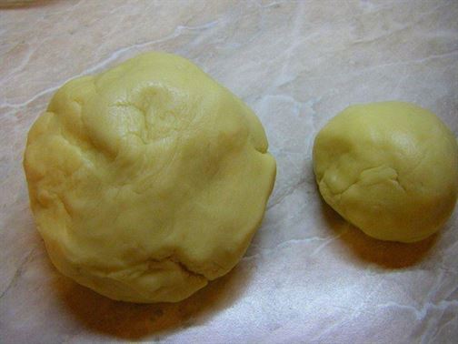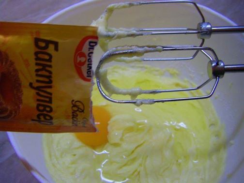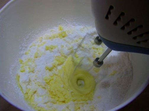 Разбийте пудрата захар с маслото до крем. Добавете яйцето, бакпулвера и постепенно брашното. Замесете меко тесто върху набрашнена повърхност.