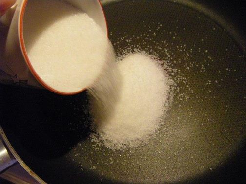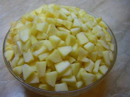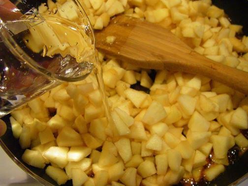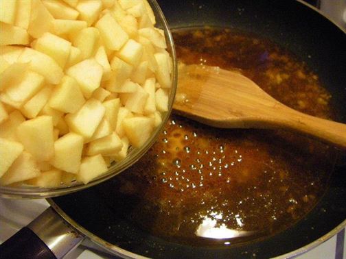 Карамелизирайте захарта до светъл карамел. Обелете ябълките, нарежете ги на кубчета и ги изсипете в карамела. Внимателно добавете водата и задушавайте 7–8 минути, като разбърквате.