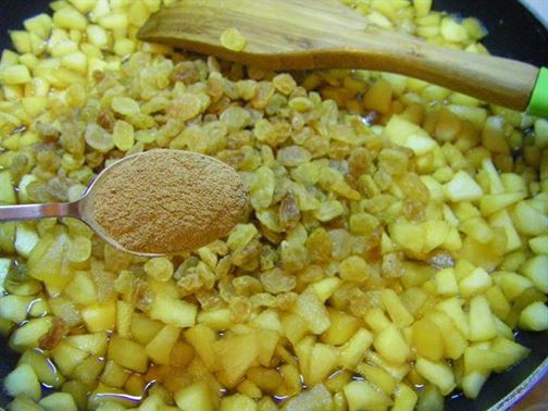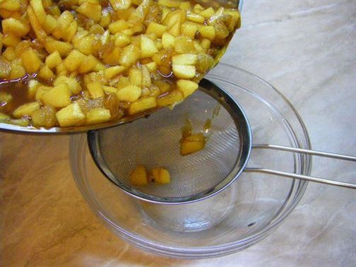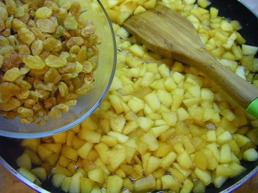 Добавете стафидите и канелата, разбъркайте и оставете на котлона още 5–6 минути. Отцедете плодовете, като запазите получения сос.