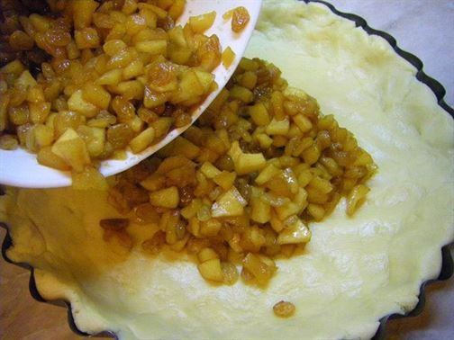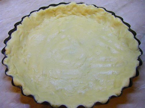 Намажете тава (около 26 см) с масло или олио и поръсете с брашно. Разстелете тестото по дъното и стените.