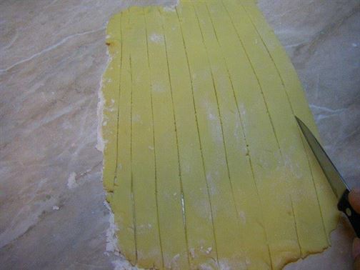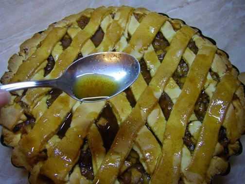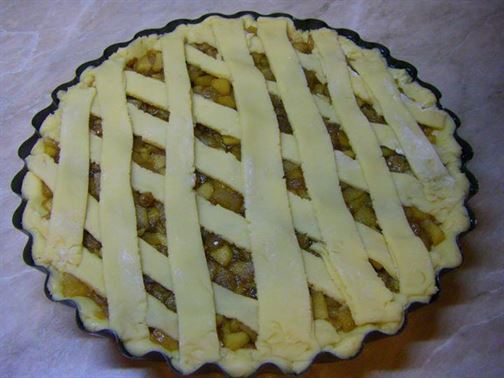 От отделеното тесто разточете и нарежете ивички, с които оформете мрежа отгоре.