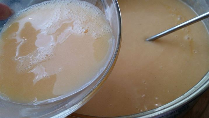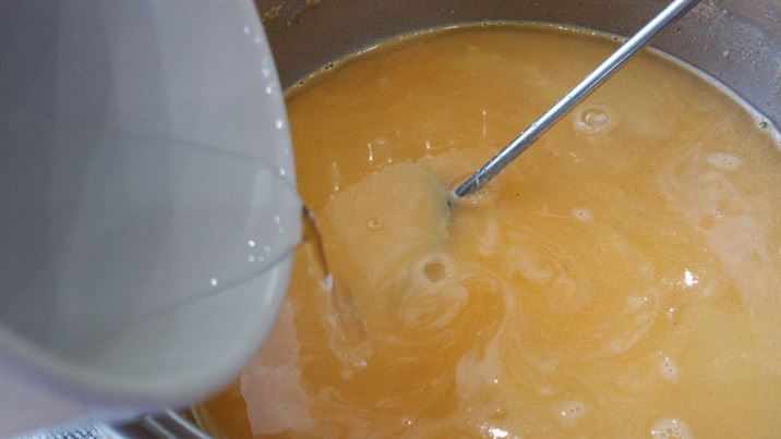 Добавете разбитите предварително яйца, като разбърквате непрекъснато.