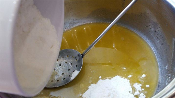 В средно голяма тенджера разтопете маслото или загрейте олиото. Изсипете брашното и разбъркайте. Оставете да се запържи, като бъркате непрекъснато.