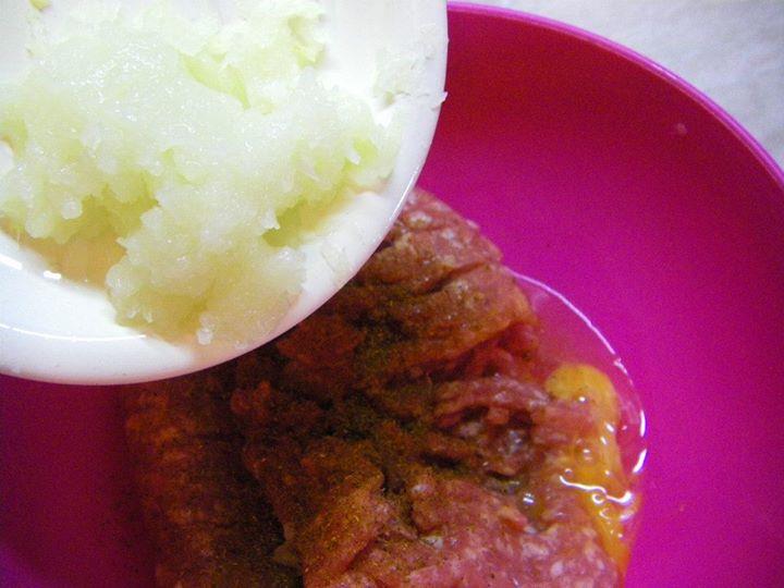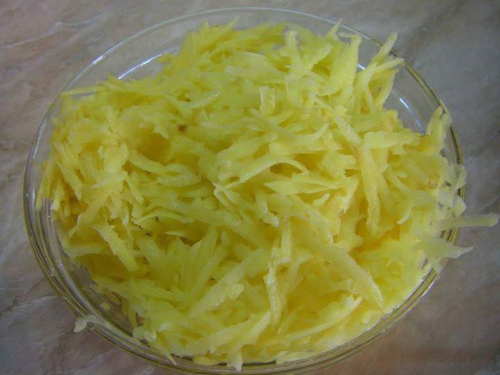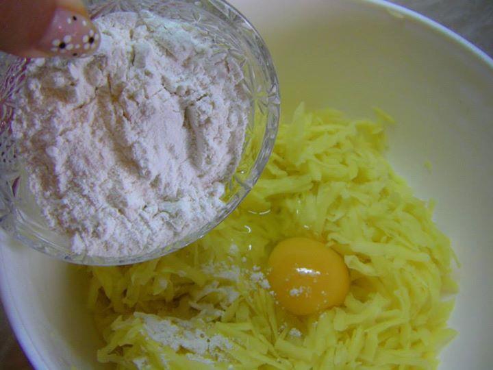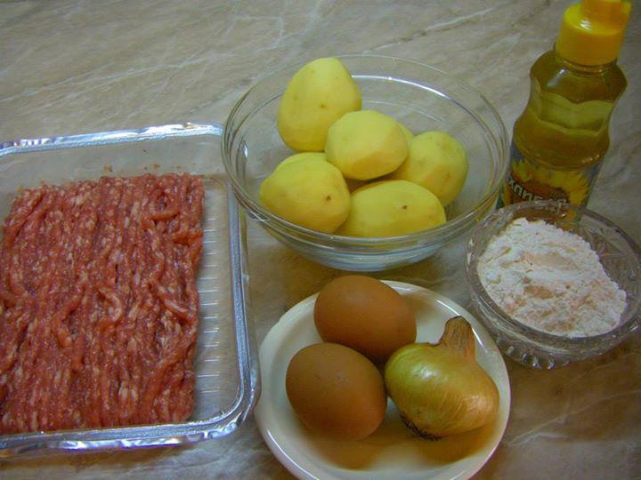 500 ГР КАЙМА, 700 ГР КАРТОФИ, 1 ГЛАВА КРОМИД ЛУК, 2 ЯЙЦА, 4 СУПЕНИ ЛЪЖИЦИ БРАШНО, 1 СУПЕНА ЛЪЖИЦА ОЛИО, СОЛ НА ВКУС.
