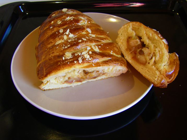 около 550 гр брашно 80 гр топено масло 3 яйца 150 мл прясно мляко 100 гр захар настъргана кора от 1/2 портокал 1 ванилия 20 гр прясна мая ЗА ПЪЛНЕЖА: 5-6 малки ябълки 1 чаена чаша захар настъргана кора от 1 лимон 3-4 супени лъжици стафиди